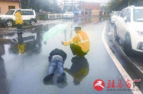 9月5日16時(shí)許,天空下著(zhù)雨,在市雪松大道與駿馬路交叉口北側,一男子醉酒后躺在馬路中間,來(lái)往車(chē)輛呼嘯而過(guò),非常危險。為了醉酒男子的安全,輔警蹲在地上為其撐起雨傘。