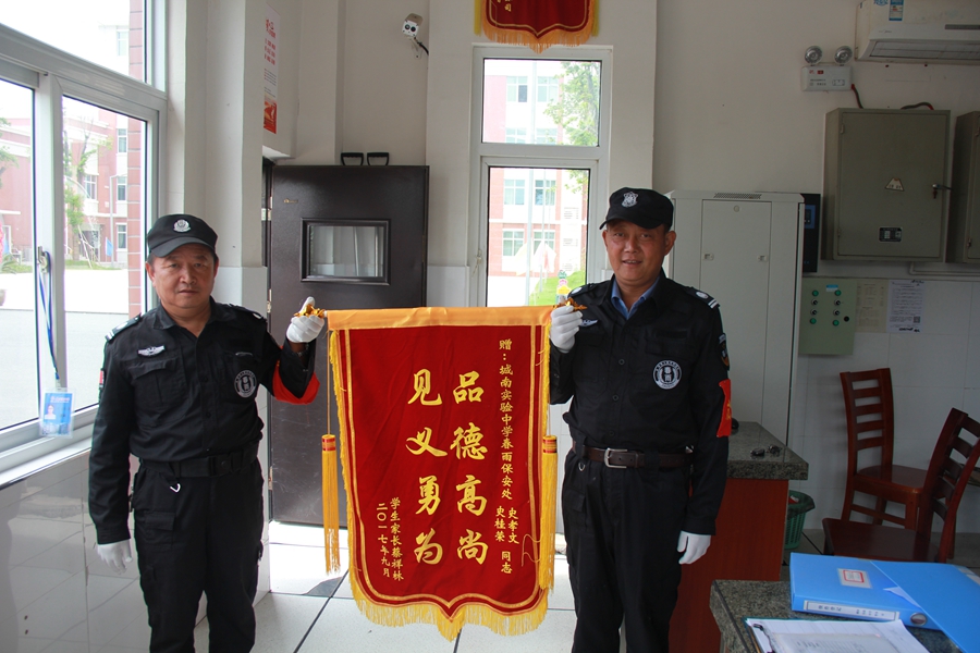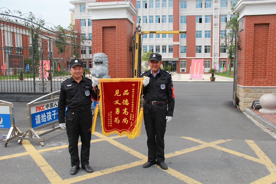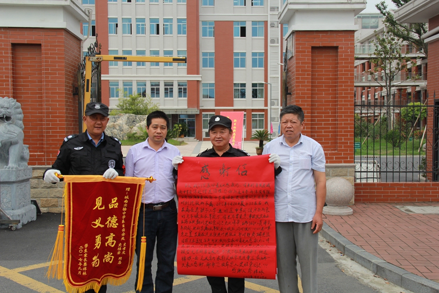 9月29日,家住城東鎮銀杏花苑的張榮蘭家屬特地將一面寫(xiě)有“品德高尚,見(jiàn)義勇為”的錦旗及一封感謝信送到了城南實(shí)驗中學(xué)安保處,表?yè)P南通春雨保安有限公司駐校保安史桂榮同志挺身而出、勇救受傷路人的事跡。