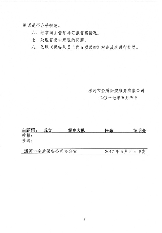 公司成立督查大隊及對鈕明亮同志任命的決定